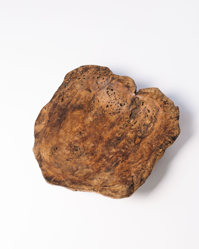 Fuente de madera orgánica en madera de Canela, tallada a mano, con acabado natural e irregular que resalta su autenticidad y calidez.